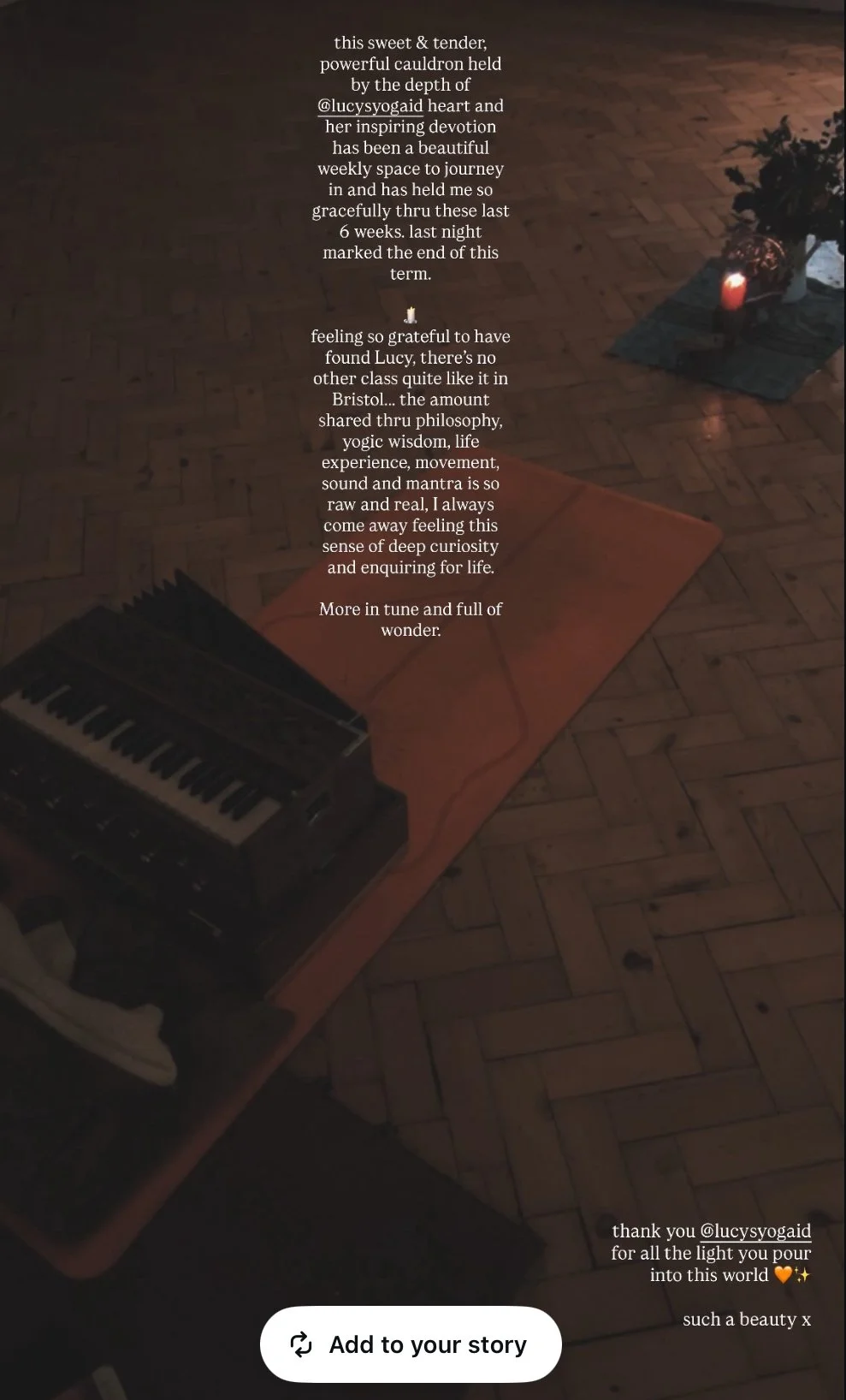 "Thankyou so much for the beautiful teachings. Four months of yoga really has transformed by body & mind. Keep working your magic."
